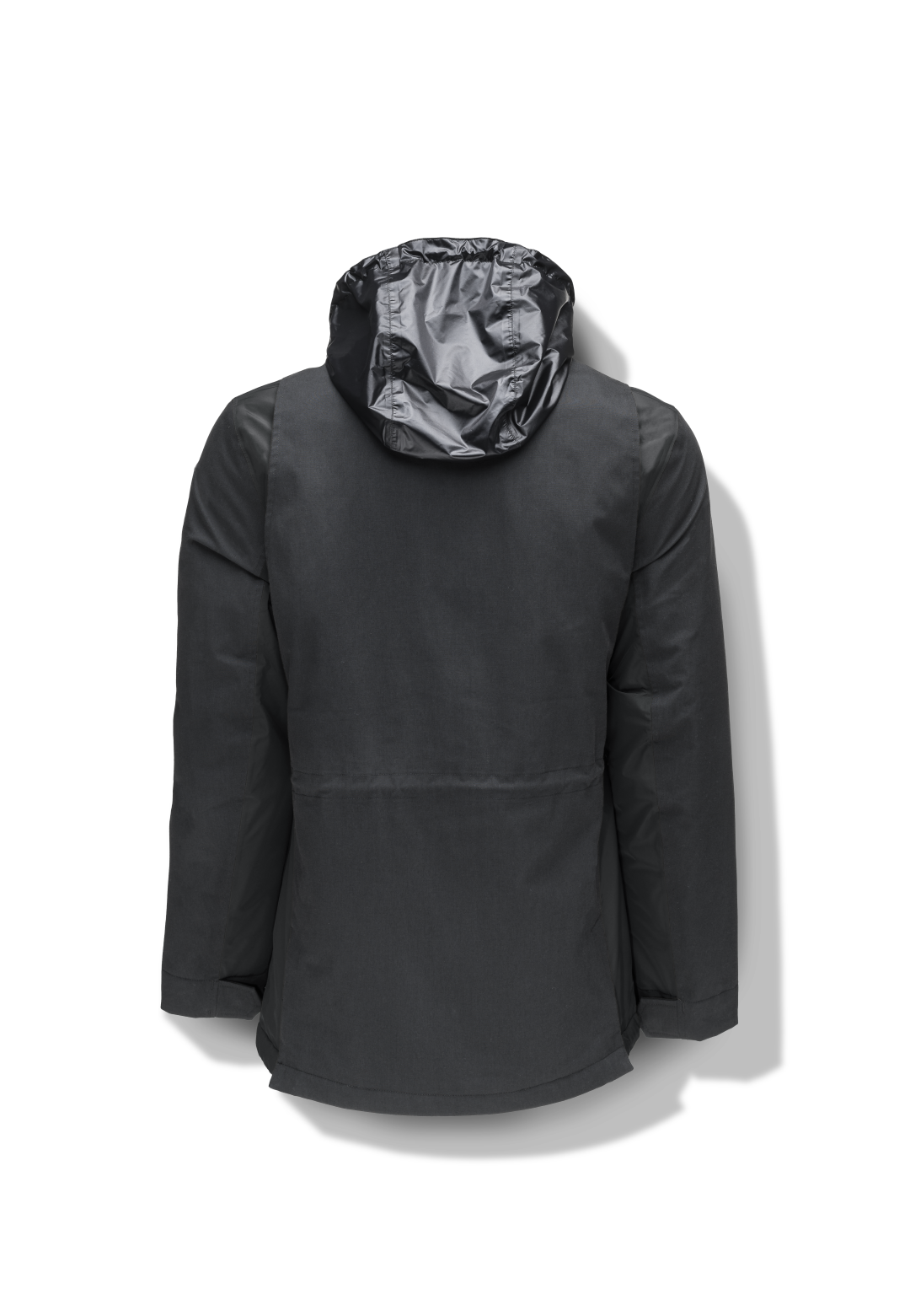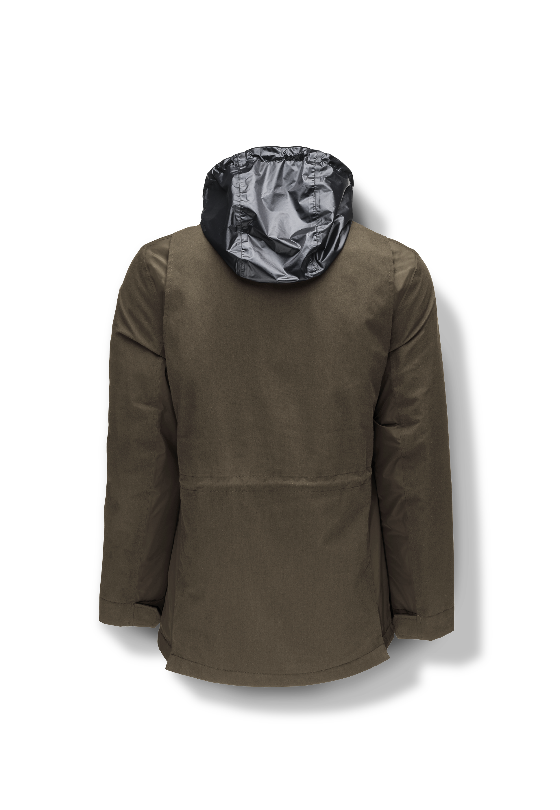 - Tuck away, waterproof hood at collar in premium cire technical nylon taffeta fabrication
