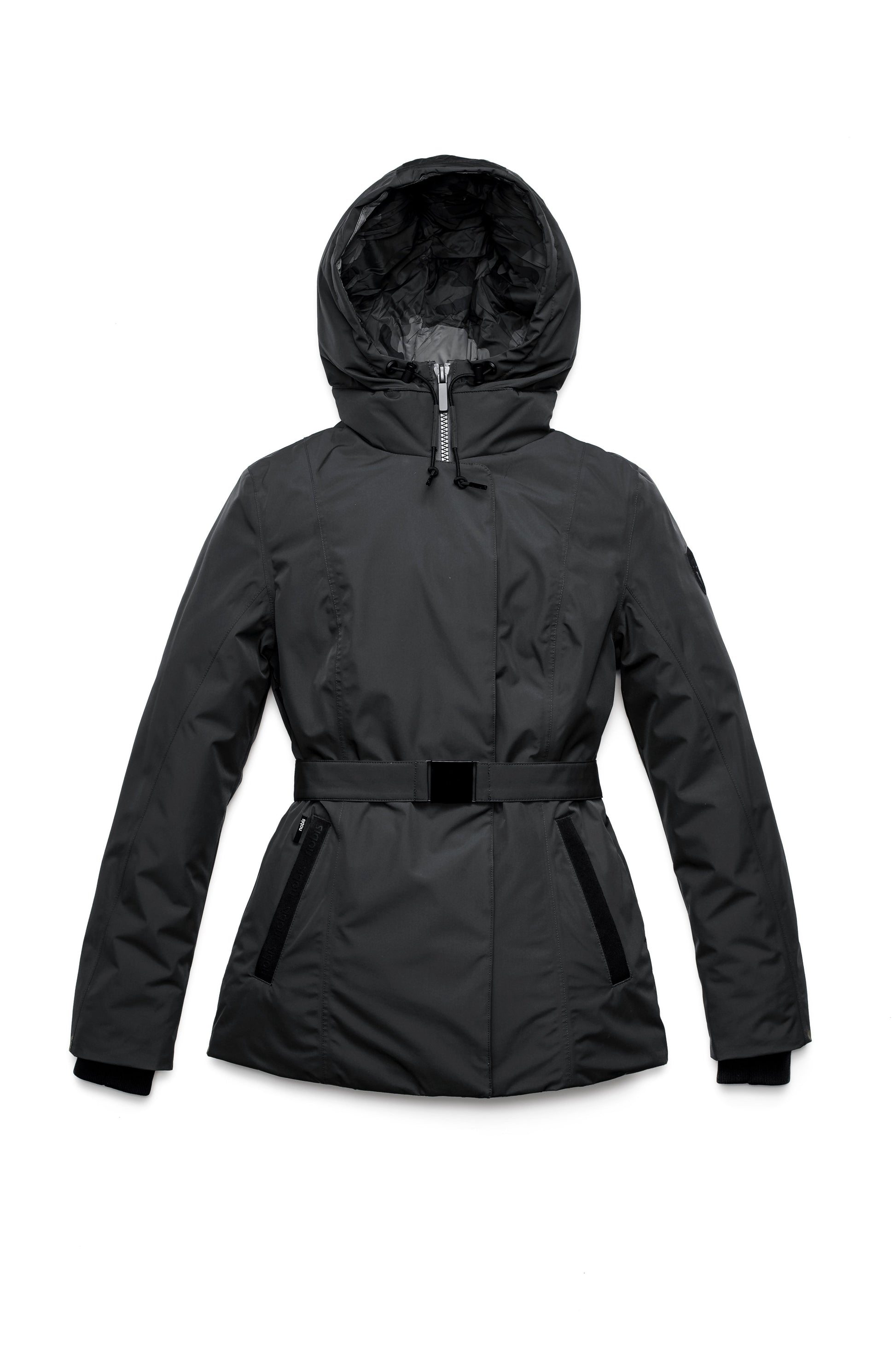 Made from premium 3-Ply Micro Denier fabric and insulated with Canadian Origin White Duck Down, this jacket offers exceptional warmth. The non-removable down-filled hood, removable belt, and telescopic inner sleeve lining provide both style and versatility. With Embrace membrane lamination and seam-sealed construction, it is windproof, waterproof, and breathable. Designed to withstand the elements while maintaining a tailored fit.